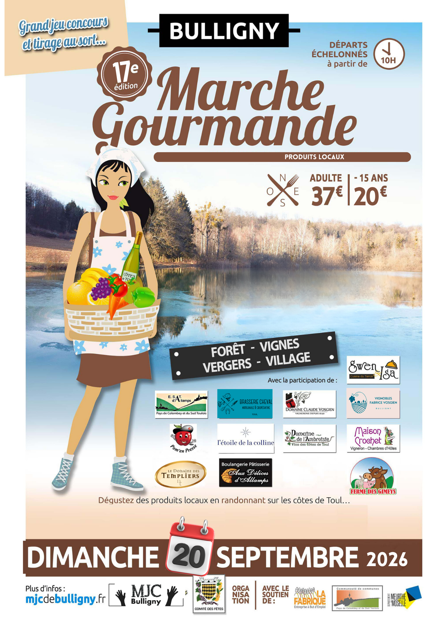 Soyez les bienvenus à la 17ème Marche Gourmande organisée par la MJC et le Comité des Fêtes de la Commune de Bulligny, le Dimanche 20 Septembre 2026.